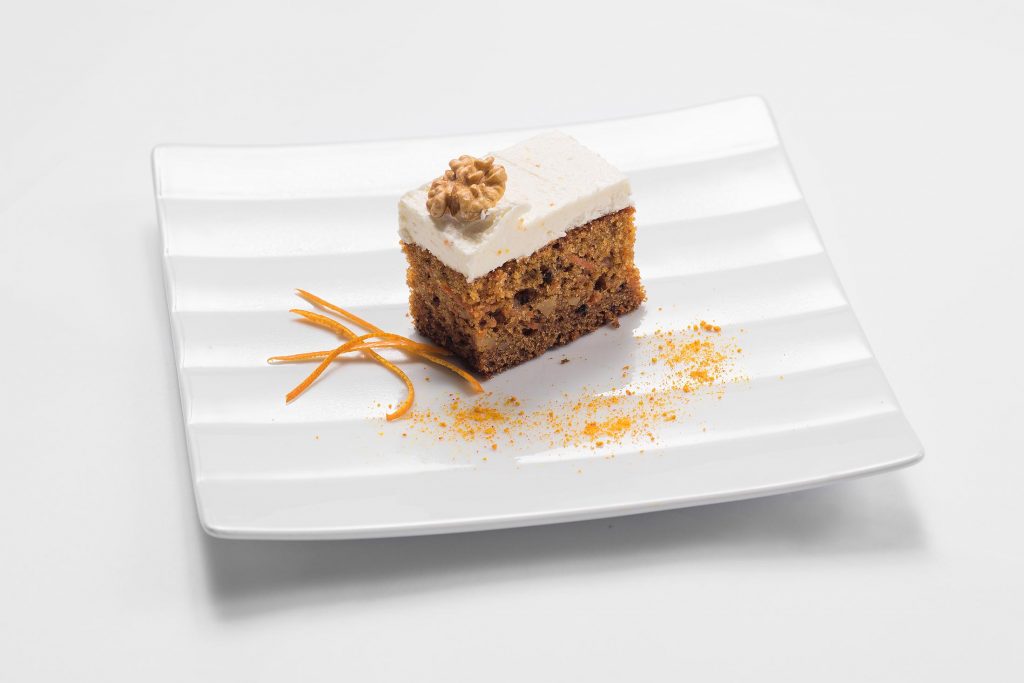 A flavorful dense sponge made with walnuts and pineapple pieces filled and covered with orange cream cheese frosting